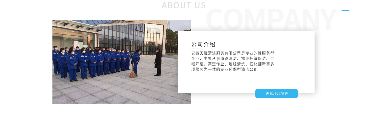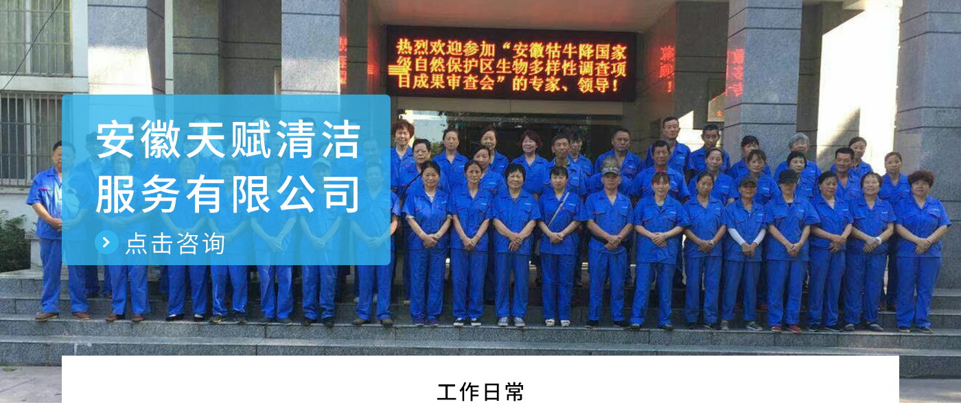 安徽天賦清潔服務有限公司是的服務型企業(yè),主要從事道路清潔、物業(yè)托管保潔、工程開荒、高空作業(yè)、地毯清洗、石材翻新等多項服務為一體的環(huán)保型清潔公司。公司管理機制完善,清潔作業(yè)經(jīng)驗豐富,擁有技術力量,嚴格實行崗前培訓—崗中督查—上崗在培訓的員工管理措施,憑著優(yōu)良的清潔質(zhì)量和嚴格的督查管理,為眾多企事業(yè)單位、醫(yī)院、酒店、廠區(qū)商場、物業(yè)、道路、學校、公園等提供后勤清潔服務。在業(yè)內(nèi)擁有良好的口碑。工作人員,服務態(tài)度優(yōu),竭力為客戶提供好的保潔服務。安徽天賦清潔服務有限公司:致力于長期合作關系,提高服務質(zhì)量,提供高標準的清潔服務。公司的經(jīng)營理念:為營造一個更清潔、亮麗的生活和工作環(huán)境而努力!“誠信”是公司成功保證。“客戶至上,信譽為首”是公司宗旨。高標準提供服務,維護客戶利益、形象,是我始終不渝的目標。
